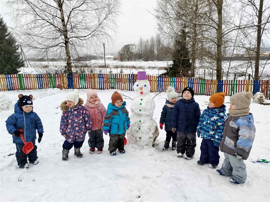 Первый долгожданный снег привел детей в восторг. С большим удовольствием расчищали дорожки, сбрасывали снег со скамеек, играли в снежки, лепили снеговика. Малыши с удовольствием создавали постройки своими силами, они были настолько впечатлены, что радости не было предела. Блестящие глазки, румяные щечки и отличное настроение - результат нашей прогулки.